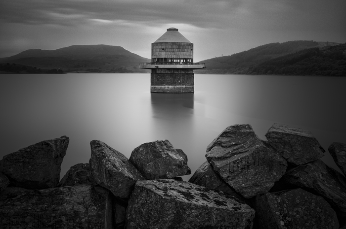 On this day it was belting down with rain, really hammering it down. And I had gone to Wales without a rain coat!! I walked along the reservoir wall getting soaked looking for an Ideal composition featuring the control tower of the reservoir. I had already settled on the idea of the valley in the distance somehow holding the structure in my composition with the jagged rocks in the foreground.