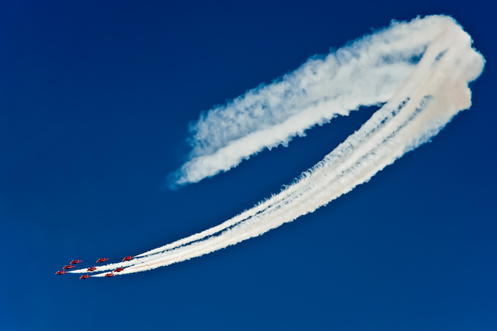 With some shots you just know you’ve got what you wanted to capture as soon as you press the shutter release. With others, you can often develop the composition with selective cropping later and with airshow photography it is generally better to zoom out a little more than usual to ensure that everything has been captured than to chop off a nose-cone or part of the smoke trail. Good luck and if you miss the first ones, keep practising!