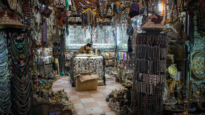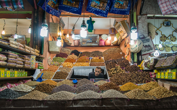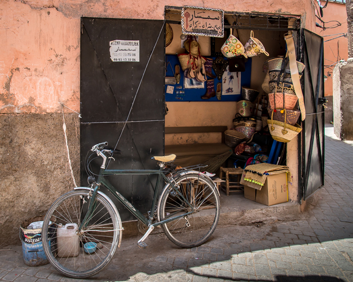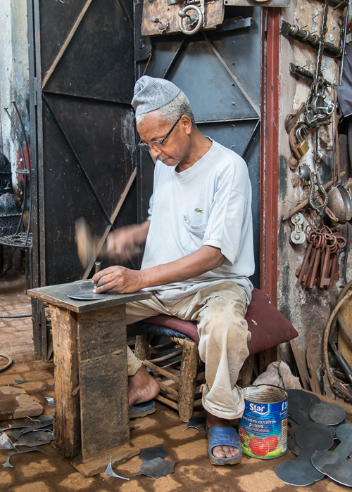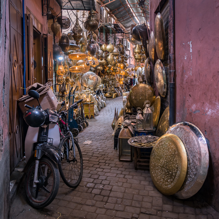 The souks themselves are helpfully divided into product groups such as bags, shoes and other leatherware; copper and ironmongery; clothing and brightly dyed fabrics; fruit, vegetables and other foods and so on. The streets are narrow and often partially covered with slatted roofs which mean that light levels are low and space is at a premium. In these conditions, I wind my ISO setting up to 800 or 1250 and juggle the best compromise between depth of field and shutter speed, often ending up with 1/10s or slower at f5.6 on my 24 – 120mm trusty ‘walkabout’ lens.