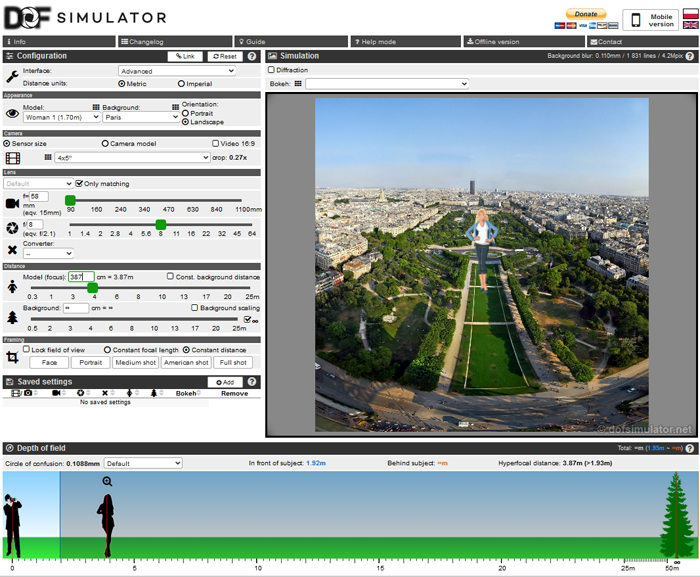 The next step was to choose the hyperfocal (distance giving the maximum depth of field) to focus on. Again I mashed the important variables into Dofsimulator to request the flange focal distance to start the design.