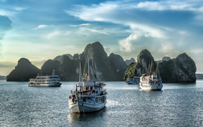 Scenery such as the dramatic limestone formations in Halong Bay
