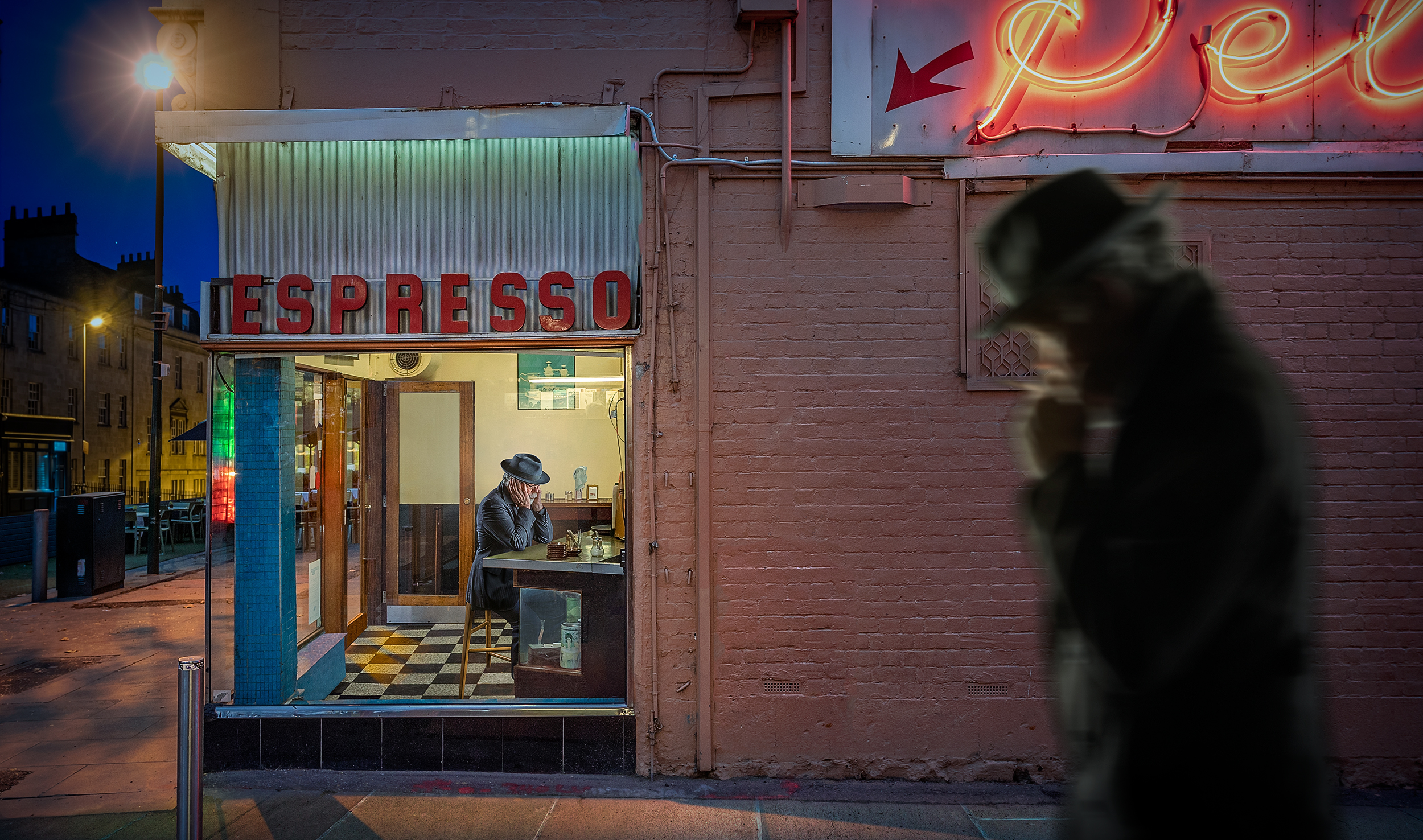 For a number of years now, my work has focussed on the ‘Lonely Man’ series. These works feature my fedora-hatted protagonist in images that tell stories of mystery and intrigue, or isolation and alienation. I try to achieve the look of a film noir movie still, emphasizing moody lighting and a sense of drama. My early works were essentially street photography captures; however, I would use post-processing to achieve a surreal other-worldly look to them. Over time, I realized that I could achieve more creativity and storytelling potential via the use of composite photography. So I began capturing figures in my home studio, where I could control the lighting and the poses and also have the capacity to place the figures in the scene where I wanted them.