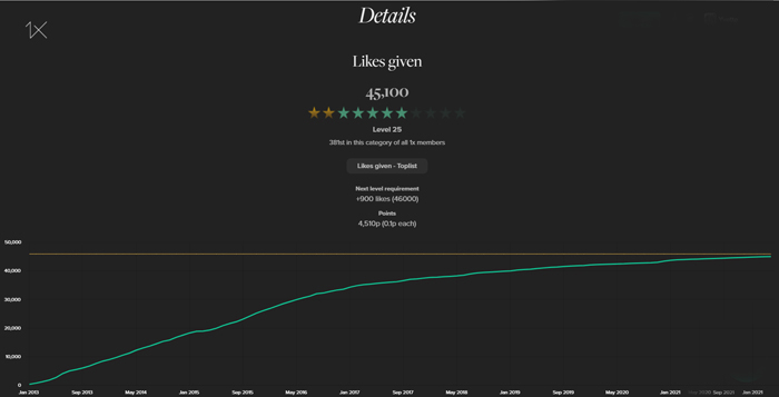 We have greatly redesigned the top lists and created a whole new activity feature where you can see detailed statistics of all your activities on 1x, including levels (0-100) for each category.