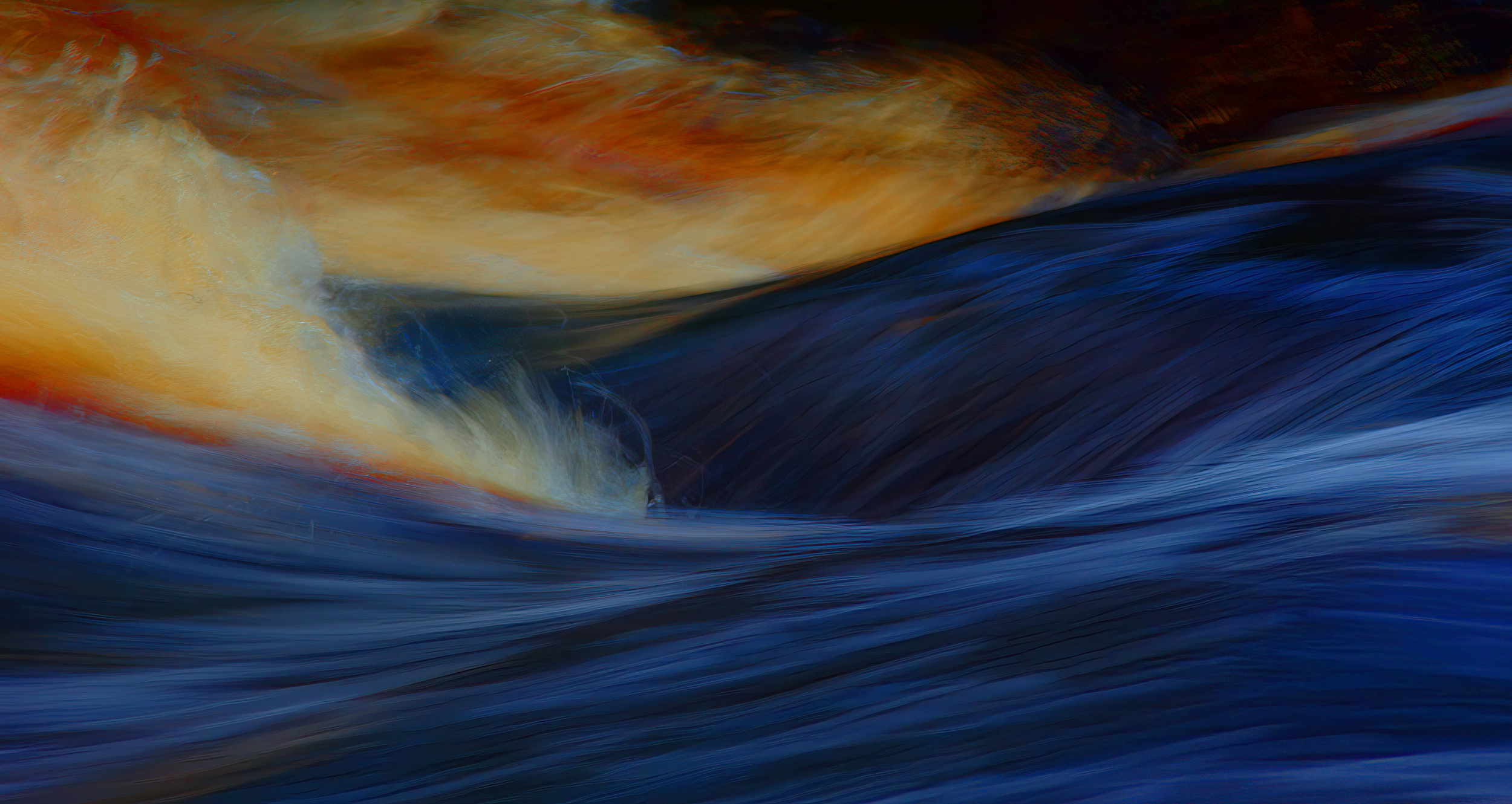 I was surrounded by imagery when growing up. My parents enjoyed art and all our walls were decorated with paintings. In junior high school, reproductions of modern art hung in the corridors. The nuances shone and spoke to me, and I felt the power of colour! Much later, I began to paint portraits and then made the acquaintance of Henri Matisse and Vincent van Gogh. I loved their strong, clear colours and disrespect for 'realism'. Their handling of colour reflected an inner reality and a joy for life while transcending boundaries. When I moved on to abstract painting and later photography, I brought all this into my creations. It works especially well for images of water. After all, water is both substantial and abstract, it is fleeting and light, poetic and beautiful, but also swirling and sometimes dangerous. My picture 'By the River' is an example of it. It is substantial, abstract, and colourful. I've highlighted a small part of a wave and accentuated the colour and shape. The river flows next to a waterfall and the surrounding land is moss land, rich in iron. Therefore, the foam turns reddish completely naturally.