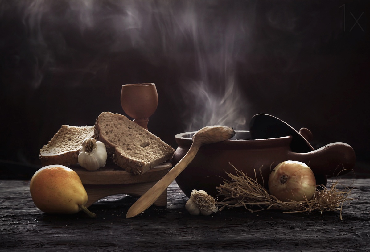In classical still life scenes, we want to create mood with lighting, be it strobe or continuous. There are a number of ways to do this, but general advice is to start with one key light and build the scene up slowly, creating a blend of light and shadowy areas by adding more lights, reflectors and even flagging areas using dark cards in front of the light to remove harsh lighting.
