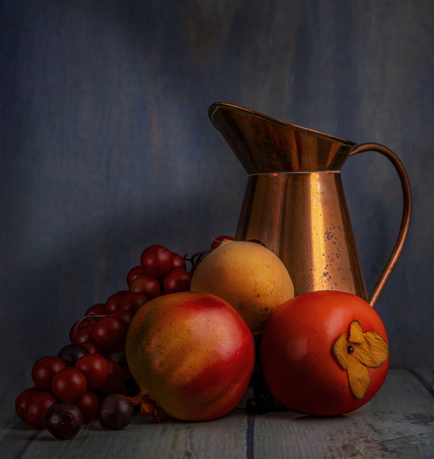 A special mood can be attained by a technique called Painting with Light. In this technique, long exposures of 5 seconds or more are made whilst selectively lighting up areas of a still life subject using a flash-light. Several exposures can be made and then combined in Photoshop, with interesting effects. One can even give a flash from the soft-box at the beginning of the exposure to give added effect.