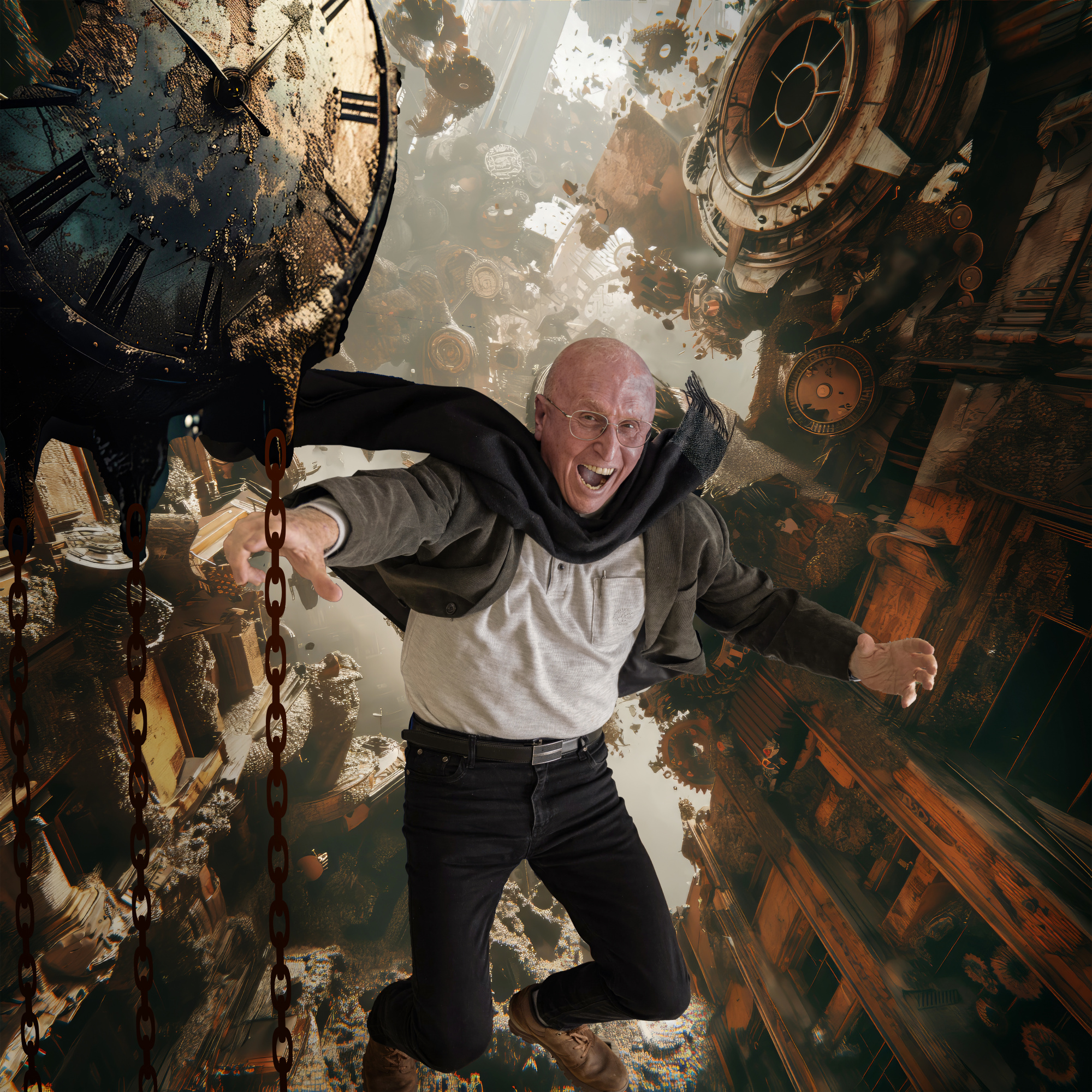 In the composition, I appear—as always—as the protagonist. My head is split open like a watermelon, revealing the face of my 13-year-old self beneath a grim, expressionless adult facade. This juxtaposition serves as both a commentary on the passage of time and a reminder that the inner child remains alive within me. On a personal note, some of the happiest moments of my life are spent with my grandchildren. Our shared curiosity and creative joy—exploring Photoshop and AI applications together—embody the timeless essence of The Inner Child.