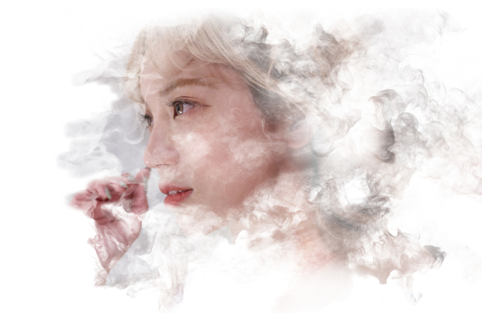 Technical Process: For this work, I used Photoshop brushes made from smoke images, applying them to specific areas of the model to make her appear as if she were dissipating. Layer masks and brushes helped refine the contours, while actual smoke overlays were added in difficult areas to create a seamless integration. Simply drawing smoke shapes can look unnatural, so I used blur filters strategically to maintain depth of field.